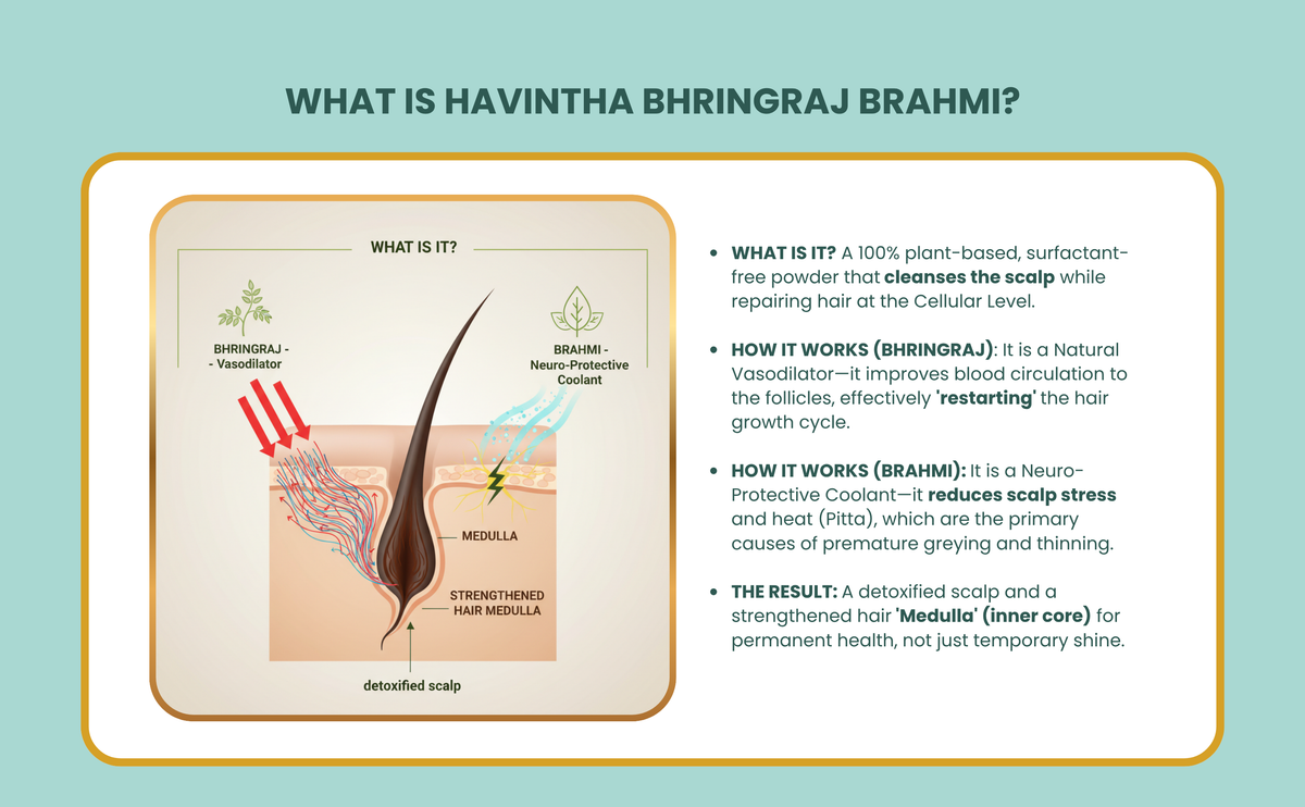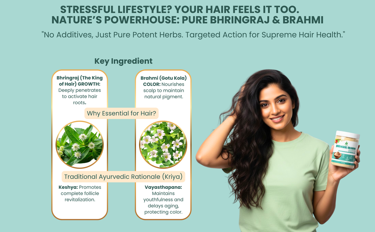 Strengthens and Stimulates Growth: Bhringraj stimulates hair growth while Brahmi strengthens the hair follicles, helping to reduce breakage and promote stronger, longer hair.
